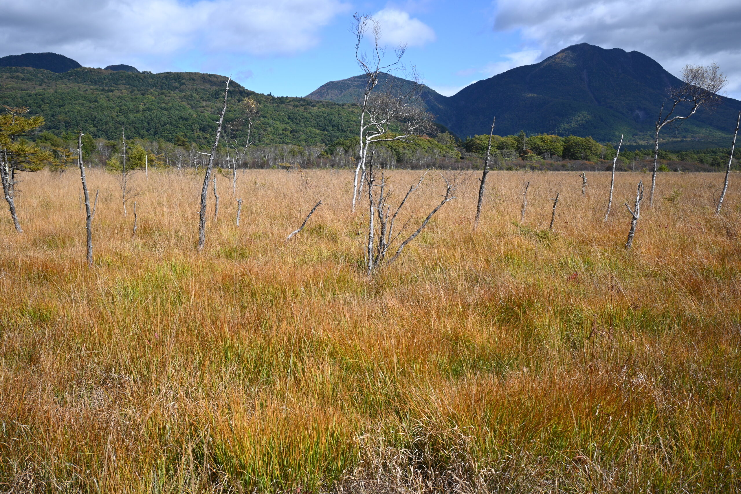 一方、湿原は濃いオレンジ色のイネ科の植物たちと風に揺れるススキやヨシがとても風情のある景色を見せてくれます。