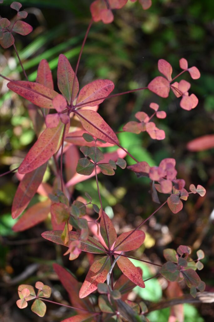 今回目についたのはタカトウダイ。普段は目立たない植物ですが、美しい紅葉に目を引かれました。