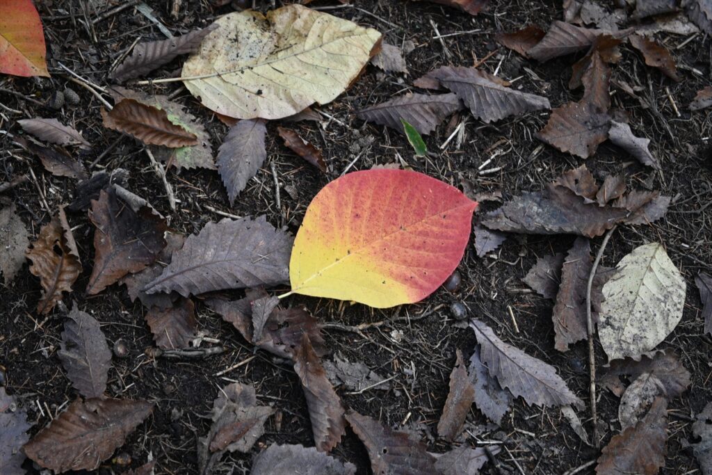 掌ほどの大きな葉が落ちていました。これも赤と黄のグラデーションが美しく、拾いたくなるのですが、