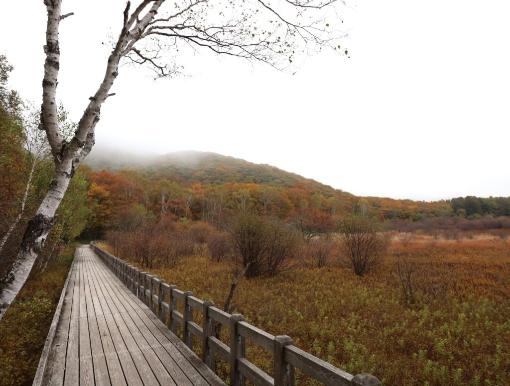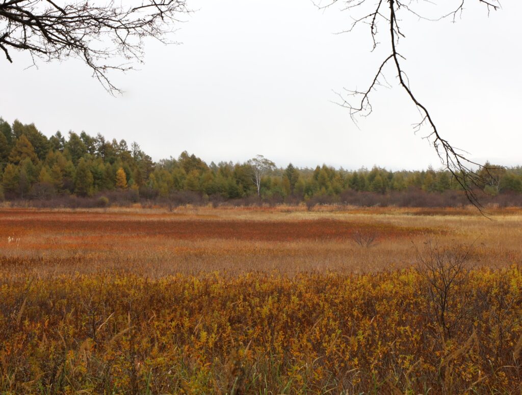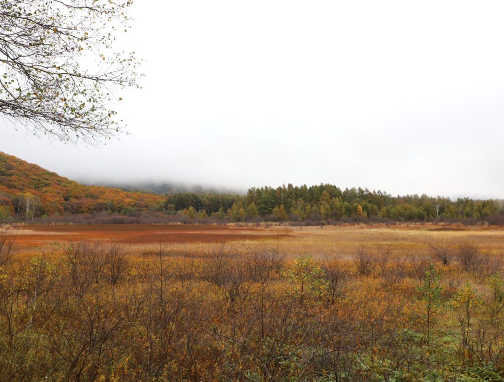 小田代原の草紅葉はまだ見頃が続いており、ホザキシモツケの赤やオレンジを楽しめますよ。