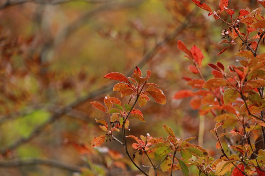 木々に囲まれた遊歩道を歩いていると、まず最初に目を引いたのはツツジの紅葉でした。一枚の葉の中で淡い緑から赤へと変わっていくグラデーションがとても美しかったです!