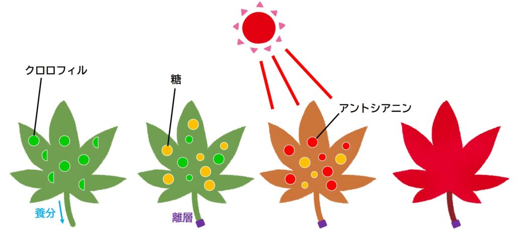 葉にわずかに残ったクロロフィルは光合成でデンプンなどの養分を作ります。これが分解されて糖になり、日光があたることで葉っぱの中で酵素と反応して赤い色素アントシアニンを作り出します。
