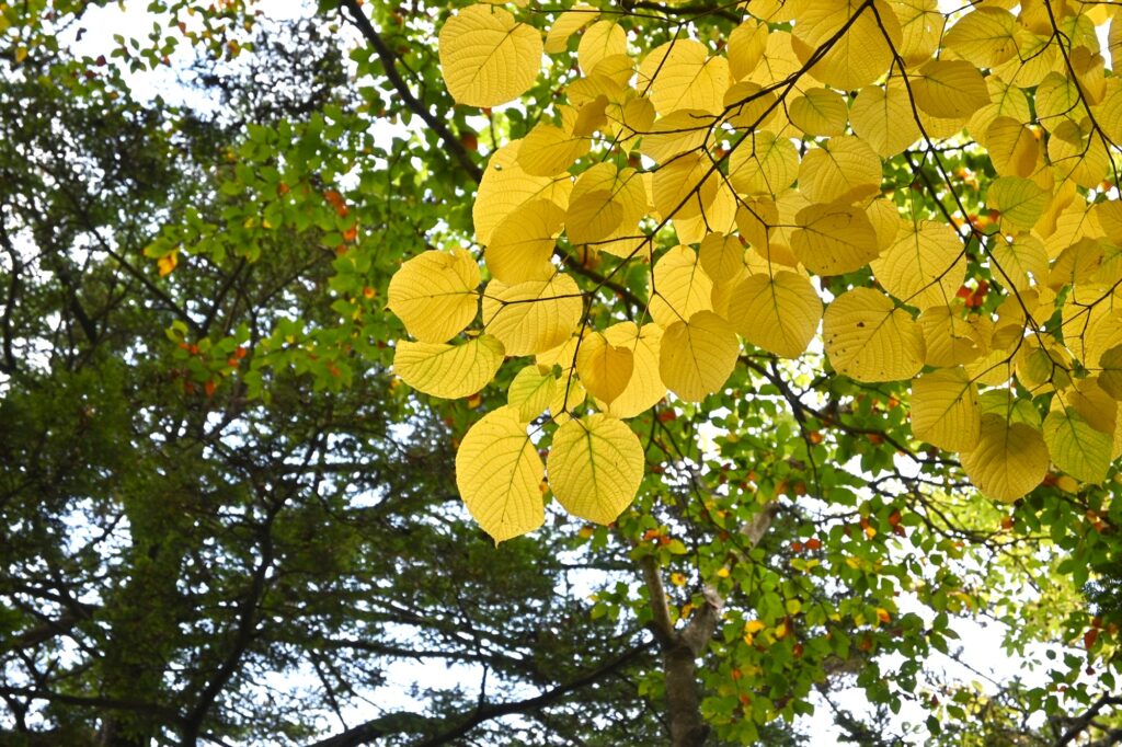 駐車場から大使館にかけての歩道沿いはカツラの黄色やヤマブドウの赤い紅葉が楽しめますが、まだまだ緑が優勢の様です。