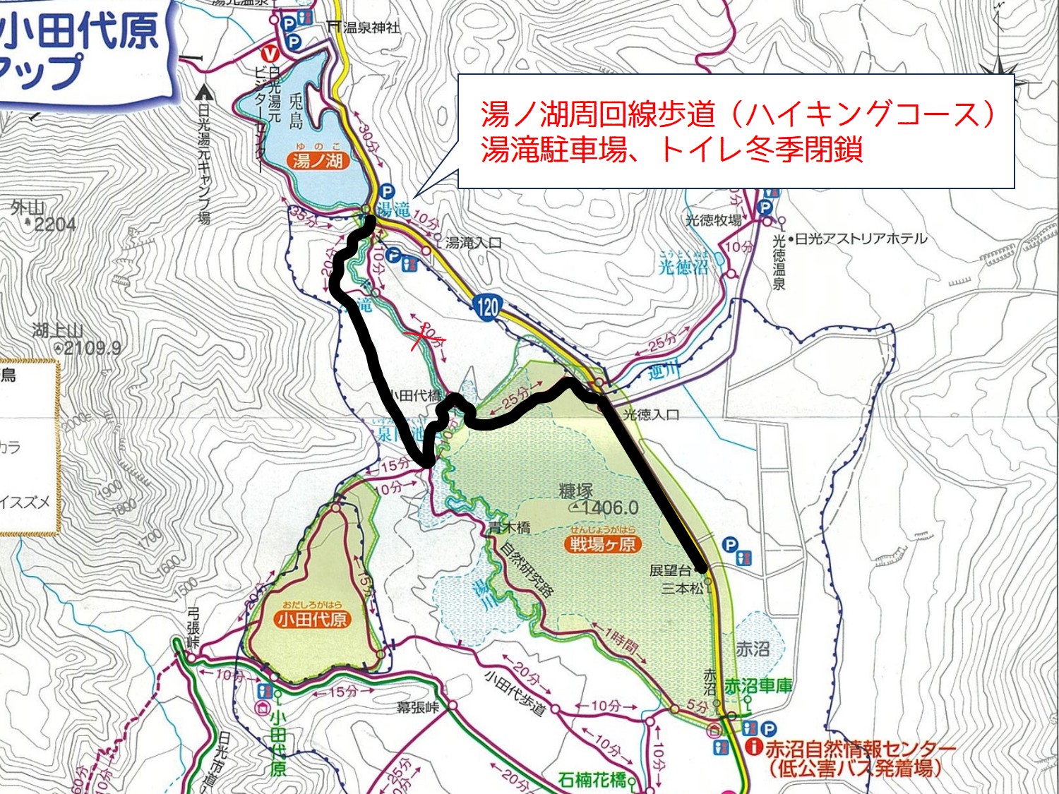 今回は湯滝からスタートし泉門池を通って、戦場ヶ原の北側、三本松駐車場まで歩いてきました。現在、湯滝駐車場とトイレは冬季閉鎖になっており、ややアクセスしづらくなってはいますが、三本松駐車場に車を置いて、バスで湯滝まで移動することが可能です。