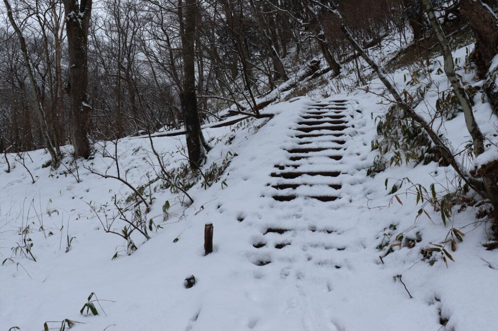 (↑間瀑台から戦場ヶ原方面へ進んで最初の階段。取材日12/24は登れたが、さらに雪が積もると段差が無くなりすべり台みたいになる。)