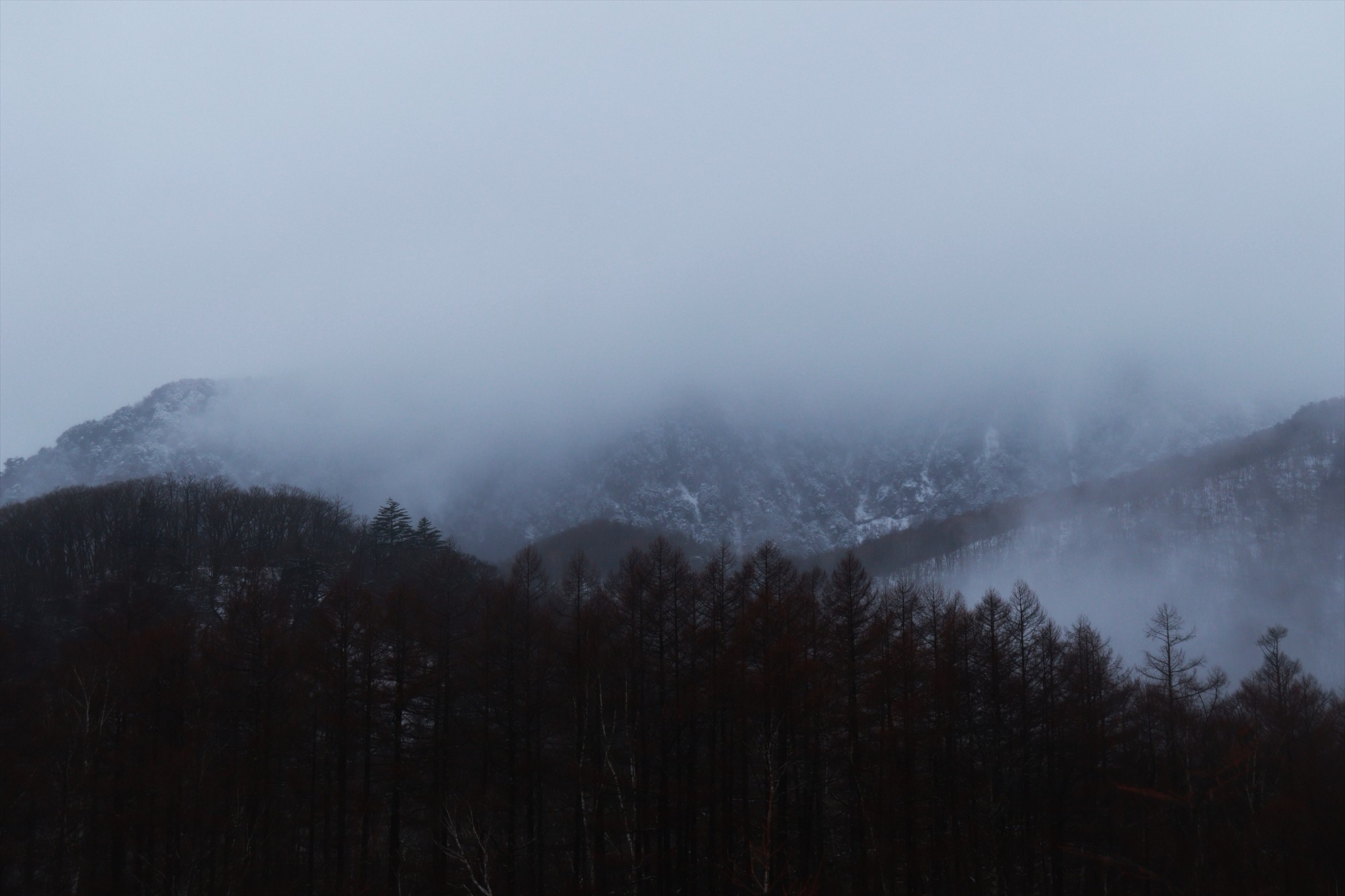 周りの山々を見ると上半分が灰色がかった雲に覆われ、厳かな雰囲気に。雲の隙間から見える山の上では、雪が降り積もっているところが見えました。