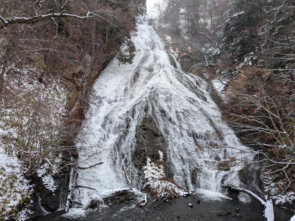 歩きだしてすぐに見えてくるのが、湯滝。夏場は周りの木々の葉とのコラボで清涼感溢れる滝なのですが、今回は葉が落ち、雪も積もっていたので、水しぶきの白と、岩壁の黒がより目立ち渋くてかっこいい印象でした。